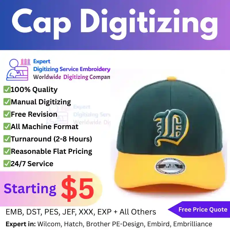 As a leading Affordable Cap Digitizing Company, we specialize in creating Machine Ready Cap Digitizing Files that are optimized for high-speed production. Whether you are a small boutique or a large-scale manufacturer, our Custom Cap Digitizing Services are designed to minimize thread breaks and maximize machine efficiency. Our team of professionals meticulously analyzes every piece of artwork to ensure that the final product is clean, crisp, and professional. With our High-Quality Cap Digitizing Online, you can trust that your brand’s identity will be perfectly rendered, providing you with a reliable foundation for all your embroidery needs.